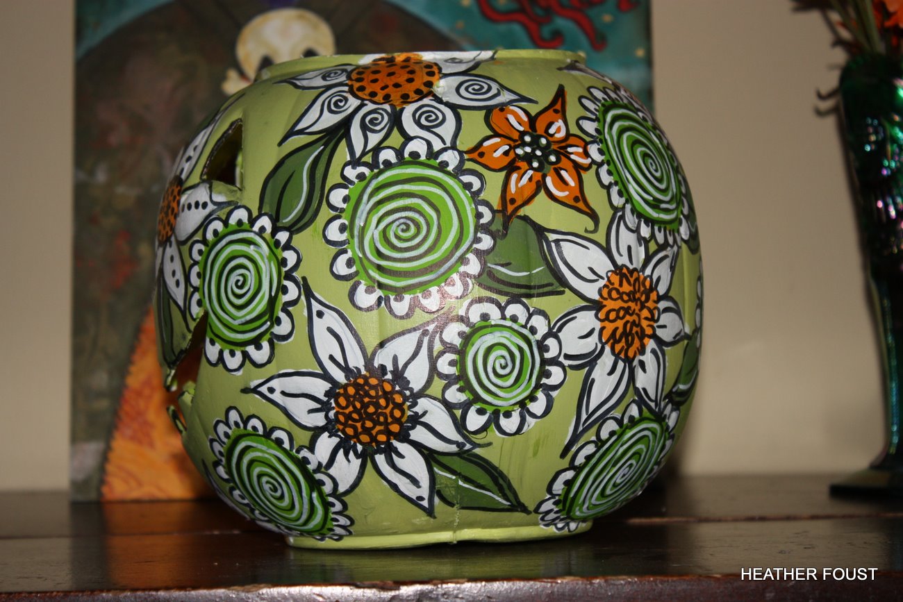These are painted plastic pumkins that you get at any store. You have to gesso them maybe 2 times before you paint on them. Then you paint away. I got this from a blog tutorial from Alisa Burke. It is the the October 13, 2009 post. So go to her blog at http://alisaburke.blogspot.com/. She is a great craftsman. She has so many ideas. You will just love her! She inspires me! She will inspire you too!